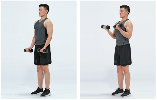 弯举过程当中上臂保持不动,尽量将注意力集中在上臂。哑铃弯举时,若真正起到锻炼作用,则在弯举时大臂前侧会有明显的收缩发力感,下落时手臂会有紧绷感。该动作不是仅仅依靠力气进行的,而是要感受肌肉的用力部分,唯有此才能够达到目标肌肉的理想锻炼状态。重量可以根据自己的力量来调整,以每组可以做10~15个动作力竭的重量为佳。