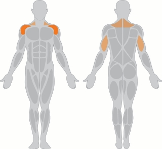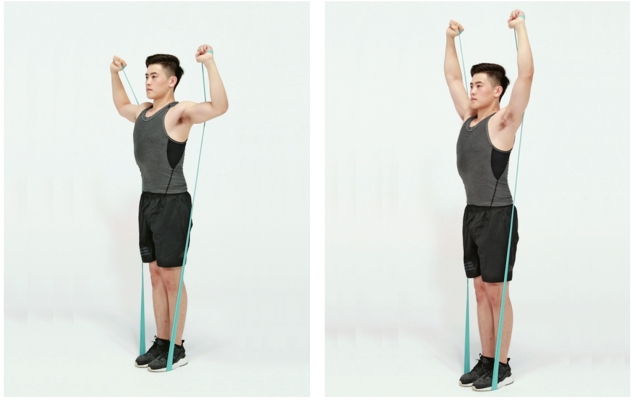 双脚踩住拉力绳,随后挺直身体使其保持平衡及稳定,以肩部为发力点进行推举,做动作的过程中肩部需要保持稳定,弹力绳推举到最高点时,停留1秒左右,肘关节要注意不能够超伸锁死,然后慢慢还原。推举的时候呼气,下放的时候吸气(图3-12)。