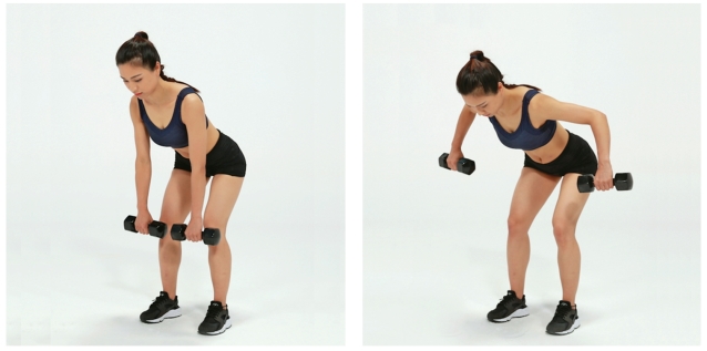 俯身重物开肘划船这个动作对于全身的运动及着力点都有较为细致的要求。首先,两只手各持一只哑铃(或重物),掌心向后,上身前倾的同时保持背部挺拔的状态,膝盖略微弯曲,颈部挺直;然后,两肘向外分开,将哑铃提升至大臂与小臂成90度,此时要保持肩部肌肉的收紧感,静止1秒,再慢慢还原。这是一整套的俯身哑铃开肘划船动作,根据自身的适应度进行锻炼,而后强度持续增加(图3-14)。