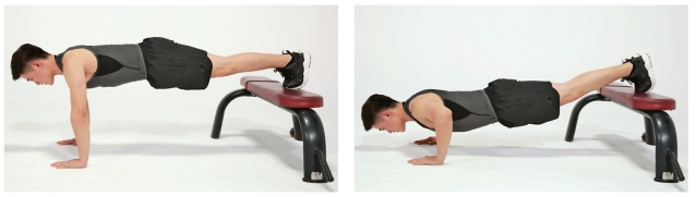 将双脚放置于固定物上,手放在地上,身体下俯到临近地面,而后再推起,待到达最高点的时候停留1秒,这样就能够使胸部的肌肉得到充分的锻炼(图4-10)。