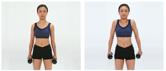 自然站立,双脚分开与肩同宽,膝关节微屈不超过脚尖,目视前方,挺胸收腹。双手握哑铃(重物)置于身体两侧。肩部上提发力,向耳根方向靠拢,同时呼气,注意力集中在肩部,使其充分收缩。吸气慢慢向下还原至初始位置,但保持斜方肌的张力不消失,如此循环(图5-6)。