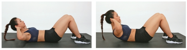 平躺于地上并将腿弯曲至与地面垂直,沉肩收腹,将脚掌作为定点,卷腹运动时脚掌定住不偏移。双手可放在两耳旁或交叉在胸前,减少双手推力作用,腰部固定住,而后肩胛骨离开地面,此为半个动作,再将肩胛骨贴至地面,此为另外半个动作,一上一下为一套动作(图6-2)。