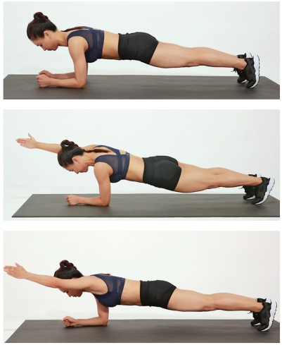 手臂抬起并停留的时间尽量保持5秒以上,该动作的核心关键点在于保持平板动作不变形,随后再增加手臂上抬的高度和停留的时间。