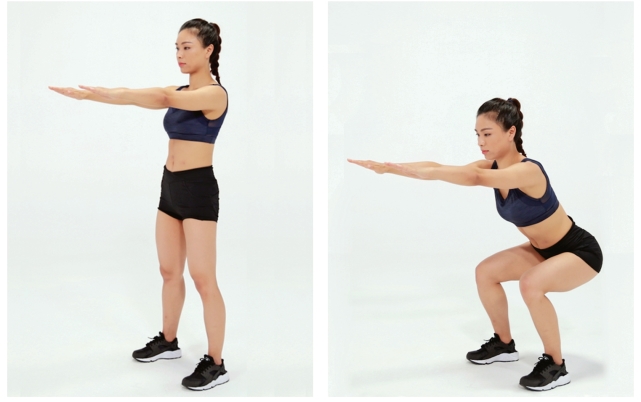 身体保持挺直状态,双脚自然站立,略宽于肩,双臂前伸,掌心向下,臀部的重心向后移,膝盖不超过脚尖;然后,进行下蹲动作,要自然流畅,最低点为臀部、大腿和脚掌呈锐角状态,而后起身还原;下蹲时为吸气状态,起身时则为呼气状态(图7-4)。