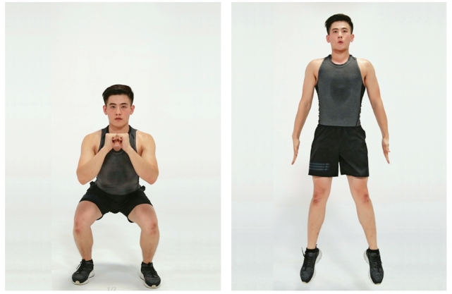 自然站立,两脚分开,与肩同宽,屈膝下蹲略向后坐,大腿与小腿角度略小于90度,小臂自然竖立于胸前,然后臀部腿部骤然发力身体跃起,落下后仍然下蹲,按照之前的动作重复进行(图7-14)。