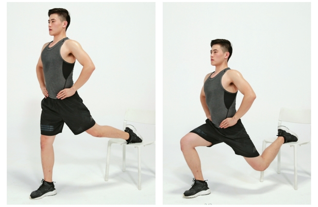 10~15个动作为一组,每条腿2~3组,两腿交替进行;下蹲的过程中,着力点在后的那只脚膝盖不能碰地,膝关节不能锁死,起身下蹲动作要自然流畅。如果觉得难度太低,可以手持哑铃等重物,增加训练强度。