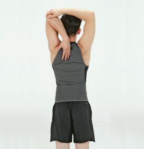 以右侧肱三头肌为例,两脚自然站立,上身挺直,收腹挺胸,下颚微收,两肩后缩,自然下沉。右手置于颈后尽量摸同侧肩胛骨,左手绕过头顶置于右手肘关节上方。左手帮助右臂大臂沿着小臂方向发力。当肱三头肌有牵拉感或略感不适时,保持10~30秒,自然呼吸。一侧伸展完毕换另外一侧(图8-3、图8-4)。