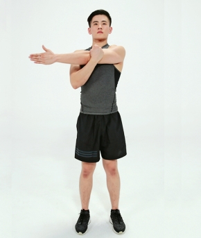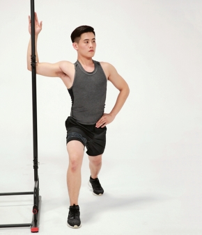 将进行拉伸动作同侧的腿向前弓步,肩膀略微耸起,同侧的小臂以及手掌紧贴墙面,大臂则与地面平行,上身前移的同时向反方向转动身体,感受胸部拉伸侧的牵拉感10~30秒(图8-11、图8-12)。