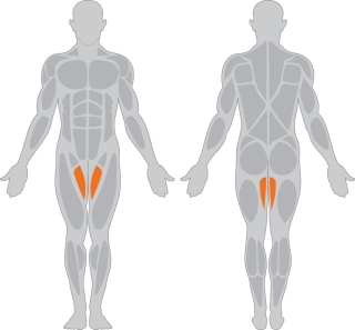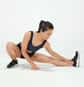 以右侧大腿为例,所要拉伸的右腿向外侧伸出,脚尖朝向为斜侧方,将重心放在左腿上,下蹲至右腿完全伸直为止,右脚脚跟着地,左腿脚掌全着地。在动作过程中,腰背要完全保持挺直的状态,用双手进行适当的支撑,使身体保持平衡而后利用身体的重量下压,从而拉伸大腿内侧。压完一侧腿后换另外一侧腿(图8-31、图8-32)。
