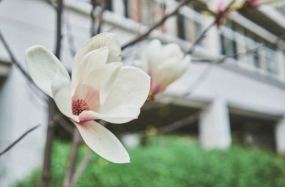 冬去春来,西南交通大学[1]校园里每年春天开放得最早的花要算是玉兰了。寒假还未结束时,一号教学楼和南区校车站旁,洁白如玉的花朵已经立满了枝头。天佑斋一号楼和八教人文学院前,也能看到它们俏立寒风中。开得最晚的一株要算二教背后大阶梯旁背阴处的一树形态极佳的白玉兰,玉兰映着红墙,特别有古典韵味。玉兰一般是先长花后长叶,生叶时花已谢,也有极其个别的,花尚能与绿叶相见,比如南区原先公共浴室对面的那一株。