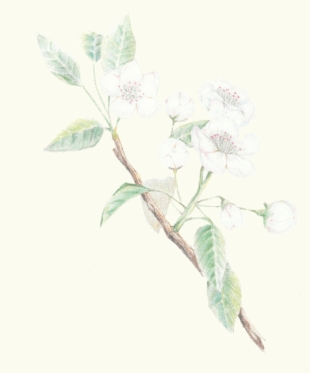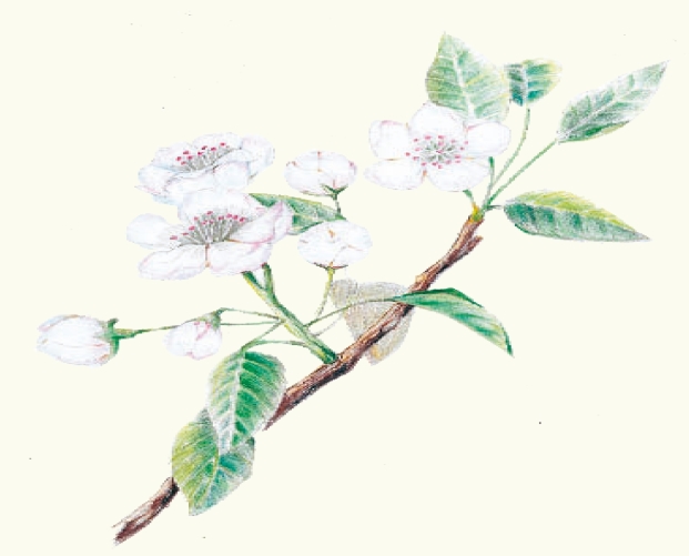 因梨花似雪白。古时梨花还有一个美妙的别称“香雪”。李渔先生的《闲情偶寄》中写道:“雪为天上之雪,梨花乃人间之雪;雪之所以少者香,而梨花兼其美。”不过,虽然雪在古人心目中常常与高洁划等号,梨花却没有蹭上古人尚白的热点,究其原因,还是名字的过错。南朝医药家陶弘景在《本草经注》中言:“梨中殊多,并皆冷利。多食损人,故俗人谓之快果。”文震亨在《本草经注》中也记有“梨者利也”。依此为据,梨应该因此得名。但古人又有爱玩谐音的习惯,比如墙壁上挂双鞋取“辟邪”之意,亮着灯就是“等”,梨也就跟着中枪,取“离”之意,于是就有了“玉容寂寞泪阑干,梨花一枝春带雨”“寂寞空庭春欲晚,梨花满地不开门”“棠梨花映海棠树,尽是生离死别处”,都不是什么吉祥之意,梨花也就跟着被《花经》贬入“五品五命”,和同取“雪”意,位列“一品九命”的“梅”悬若霄壤。