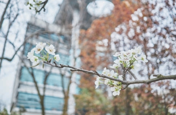 交大的梨花,生在二教前的虹桥边。春波碧草,梨雪随风飘散,千古诸事,美人如斯,当浮一大梨花白。