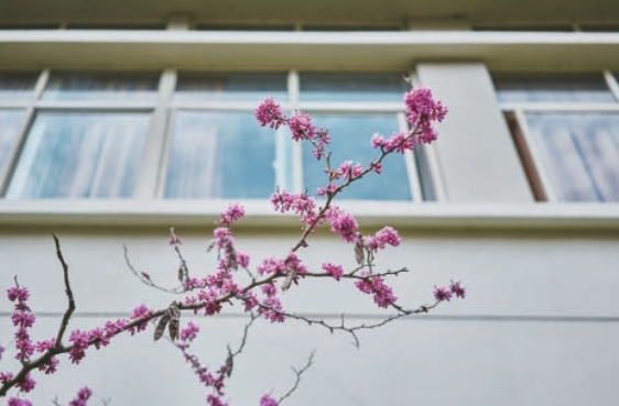 我们今天要说到的紫荆,是豆科正儿八经的紫荆族紫荆属的紫荆。开花要在晚春时候,有时候临近夏日,它都还是灰白色干干净净的几根枝条。忽然在某一天呢,紫红色米粒大小的花朵密密麻麻地开得满树都是,紧紧地绕着树枝,连树干都不放过,给诸位密集恐惧症患者冷不防一个巨大的惊吓,直到桃心形的叶子生出来,才能稍微安抚一下受伤的小心脏。