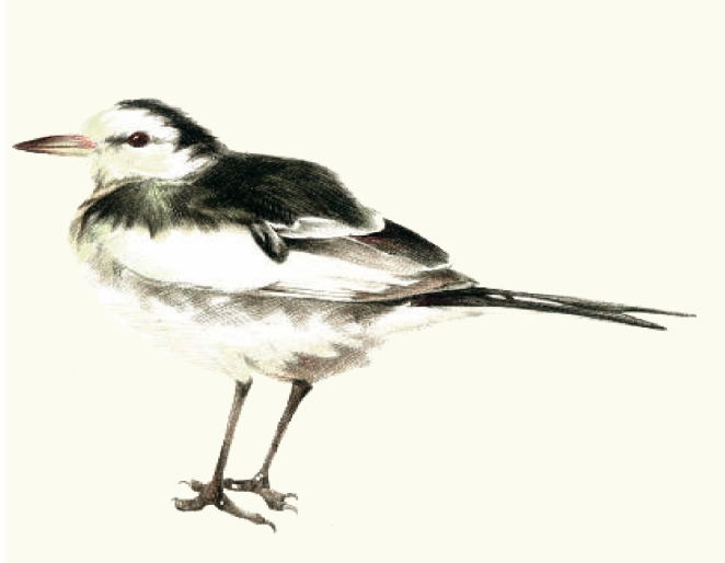 我的大学室友是个绍兴姑娘,她把这种和熊猫配色一致的细脚小鸟唤作“张飞鸟”,说是,似乎江浙一带的人们都这样叫。鲁迅先生的《从百草园到三味书屋》中记叙了一段“雪地捕鸟”的趣事,“所得的是麻雀居多,也有白颊的‘张飞鸟’,性子很躁,养不过夜的。”白鹡鸰得名“张飞鸟”,和它的性子无关,一说是因为像京剧脸谱里的张飞。野生鸟多半都像人们俗说的,“气性大”,说是“气死”,其实“吓死”的是大多数。鸟类的神经非常敏感,稍微有点风吹草动就一惊一乍的,更何况是被迫沾上一身人的气味,再被锁进笼子里,很容易就吓出毛病来了。野鸟一没安全感就不吃不喝,“开食”的少之又少。鲁迅先生捕鸟,用的是秕谷做诱饵,所以捕到的大多数是麻雀。鹡鸰是食虫鸟,捕捉害虫的小能手,偶尔杂食换换口味也吃些谷类。本来就吓得半死,还喂一个肉食主义者一把谷子,白鹡鸰肯定得被活活“气死”。驯化野生鸟,不知道要以多少无辜小家伙的生命为代价,还是让它们在“林间自在啼”吧。