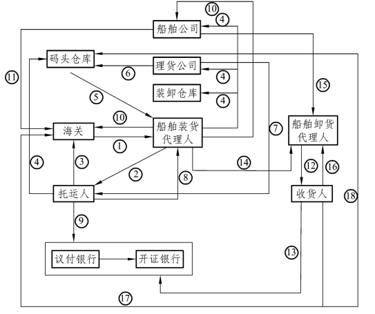 由于班轮运输涉及班轮公司、托运人、收货人、理货公司、装卸公司和船公司代理人等各方,环节较多,此处只涉及与货主有关的运输流程中的相关货运单证的流转情况,如图3-1所示。