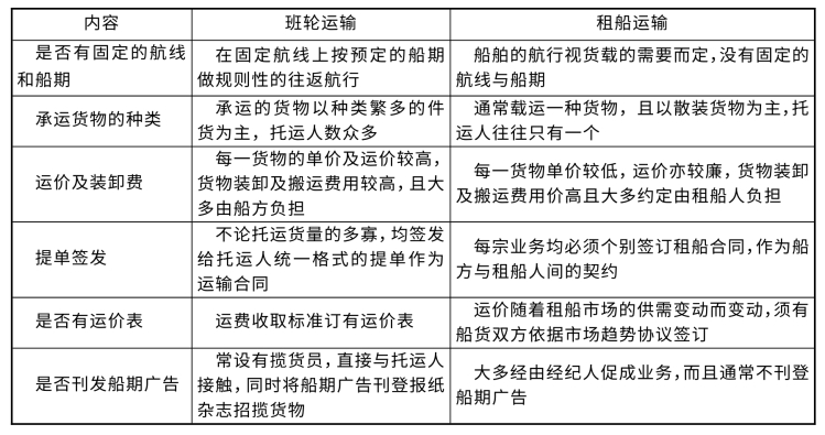 (2)风险责任划分与租金水平由租船合同约定。班轮运输中船舶的一切正常营运支出均由船方负担,而租船运输中船舶营运中的风险以及有关费用的责任负担由租船合同来约定。没有固定的运价,租船运价受租船市场供求关系的制约,船多货少时运价低,反之则高。
