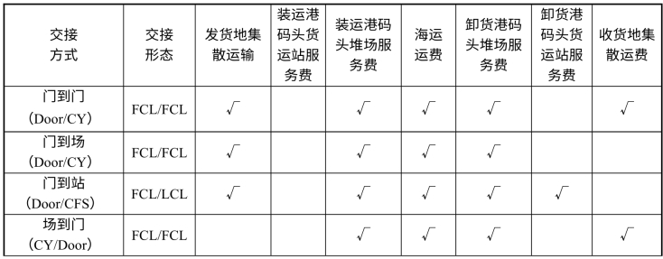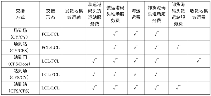 在集装箱整箱货、拼箱货流转过程中,其货物的交接方式不同。因此每一种交接方式下的费用结构也有所不同(如表5-3所示)。
