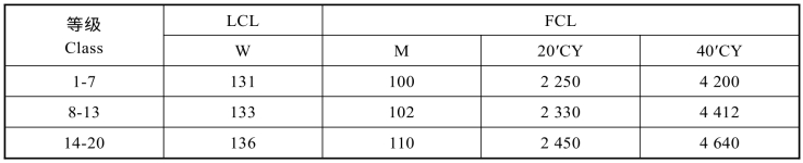 FCS包箱费率是按不同货物种类和等级制定的包箱费率。在这种费率下,一般(如中远运价本)将货物分为普通货物、非危险化学品、半危险货物、危险货物和冷藏货物等几大类,其中普通货物与件杂货一样为1~20级,各公司运价本中按货物种类、级别和箱型规定包箱费率,但集装箱货的费率级差要大大小于件杂货费率级差,参见表5-5。