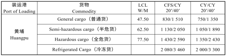 表5-4 中国—新加坡航线集装箱资费表(FAK) 单位:美元