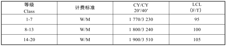 FCB包箱费率是指按不同货物的类别、等级(Class)及计算标准(Basis)制定的包箱费率。在这种费率下,即使是装有同种货物的整箱货,当用重量吨或体积吨为计算单位(或标准)时,其包箱费率也是不同的,这是与FCS费率的主要区别之处,参见表5-6。