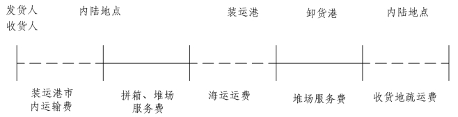 运费=装运港码头货运站服务费+装运港码头堆场服务费+海运运费+卸货港码头堆场服务费+收货地集散运费。