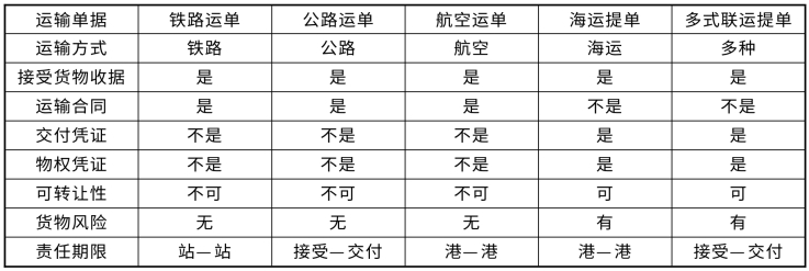 表9-3 多式联运提单与各单一方式运输单据的主要差别