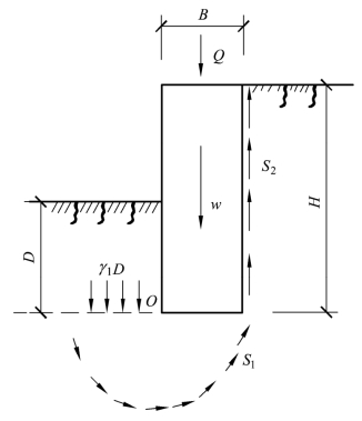 开挖较深的软黏土基坑时,如果桩墙的重量超过基坑底面以下地基的承载力时,地基中的平衡状态受到破坏,就会发生坑壁土流动,坑顶下陷、坑底隆起的现象,为防止这种现象发生,需验算地基是否会产生隆起。常用地基稳定验算法如图2.18。