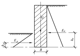 如图2.16,水泥桩支护墙如截面、重量不够大,在墙后推力作用下,会产生整体倾覆失稳,抗倾覆安全系数为