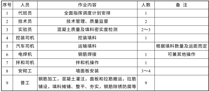 由于预制面板、拉筋与墙体建筑施工不同时进行,故可由同一组人员完成预制混凝土件和墙体建筑操作,详细劳动力组织见表2.31。