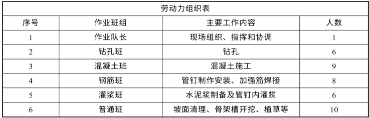 班组:①边坡清理及骨架基础开挖级;②钻孔组;③注浆组;④钢筋制作组;⑤混凝土施工组;⑥土工格室安装及培土植草组。