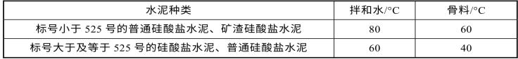 当需要提高水温时,可将水与骨料先行搅拌,使砂石变热,水温降低后,再加入水泥共同搅拌。石料由于用量多,重量大,加热比较麻烦,当需要骨料加热时,应先加热砂,确有必要时再加热石料。水泥由于上述原因不得直接加热。拌合用水及骨料加热的温度,应符合拌和水及骨料最高温度如表4.3所示。