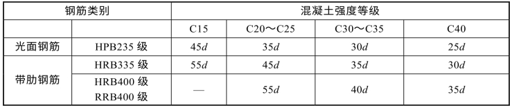 钢筋搭接处,应在中心及两端用20~22号铁丝扎牢。受拉钢筋绑扎连接的搭接长度,应符合表的规定。