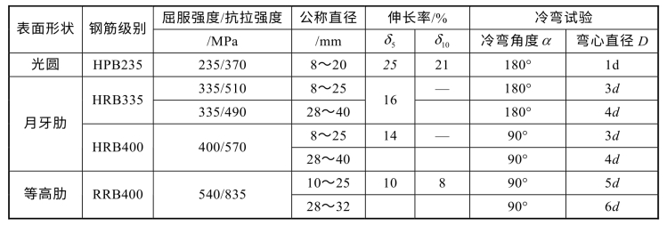 钢筋按力学性能分为:I级钢筋(235/370级,即屈服点为235 N/mm2;抗拉强度为370 N/mm2)。Ⅱ级钢筋(335/510级)、Ⅲ级钢筋(370/570级)和Ⅳ级钢筋(540/835级)等。此外,钢筋还可按轧制外形分为:光圆钢筋和变形:钢筋(月牙形、螺旋形、人字形钢筋);按供应形式分为:盘圆钢筋(直径不大于10 mm)和直条钢筋(长度为6~12 m);钢筋按直径大小可分为:钢丝:(直径3~5 mm)、细钢筋(直径6~12 mm)、中粗钢筋(直径12~20 mm)和粗钢筋(直4径大于20mm)。[HPB235(Ⅰ级),为热轧普通钢筋;HRB335(Ⅱ级),为热轧带肋钢筋;HRB400(Ⅲ级),为热轧带肋钢筋;RRB400(余热处理Ⅲ级),为余热处理带肋钢筋]。钢筋出厂应有出厂证明书或试验报告单。钢筋运到工地后,应根据品种按批分别堆存,不得混杂,并应按施工规范要求对钢筋进行机械性能检验,不符合规定时,应重新分级。钢筋在使用中如发现脆断、焊接性能不良或机械性能显著不正常时,还应检验其化学成分,检验有害成分硫,磷、砷的含量是否超过允许范围。
