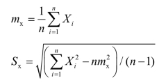 测区混凝土声时(或声速)、波幅、频率测量值的平均值(mx)和标准差(sx)应按下式计算:
