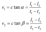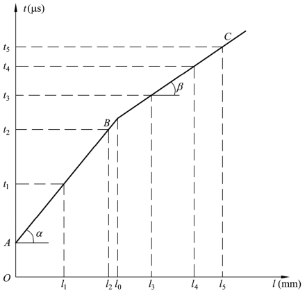 以各测点的声时值ti和相应测距值li绘制“时-距”坐标图(图7.1),两条直线的交点B所对应的测距定为l0,直线AB的斜率便是损伤层混凝土的声速v1,直线BC的斜率便是未损伤层混凝土的声速巧v2,则