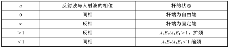 因此,vp1ρ1及vp2ρ2为上、下段的阻抗。当a=1时,弹性杆连续,无突变。然后,截面A变化(缩、扩颈),或者质量密度ρ变化(孔隙、夹泥等),或者弹性波传播速度vp变化(疏松与硬化),都会使a不为1,形成不连续面,产生反射,如表7.2。