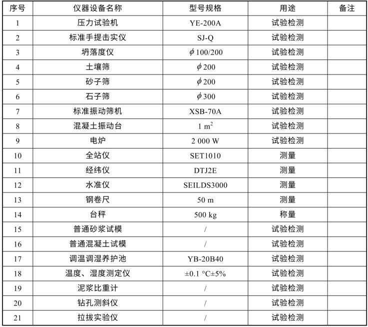 表2 拟配备本工程的试验和检测仪器设备表