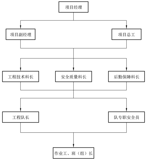成立以项目经理为组长,分管安全生产的副经理和项目总工程师为副组长,工程技术科长、安全质量科长、后勤保障科长、项目部专职安全员为成员的安全生产领导小组,队设专职安全员,各作业班(组)设专职安全员,形成一个强有力的安全生产管理网络体系。详见《安全施工管理组织机构图》。