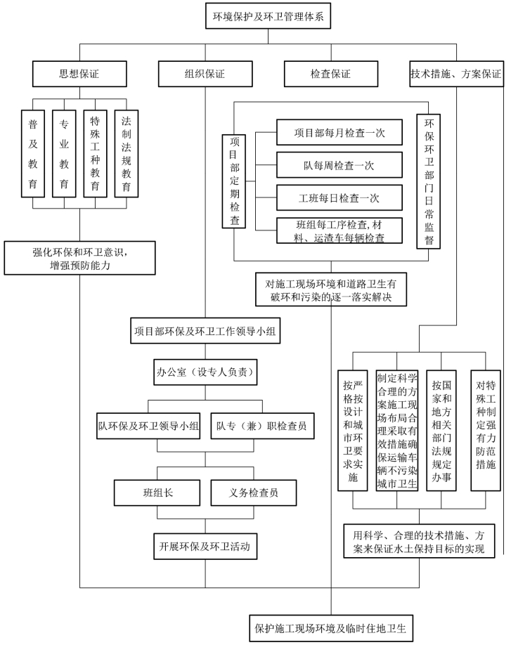 环境保护及环卫管理体系必须从思想上、组织上、技术措施、方案和检查保证制度上四个方面体现,详见图9。