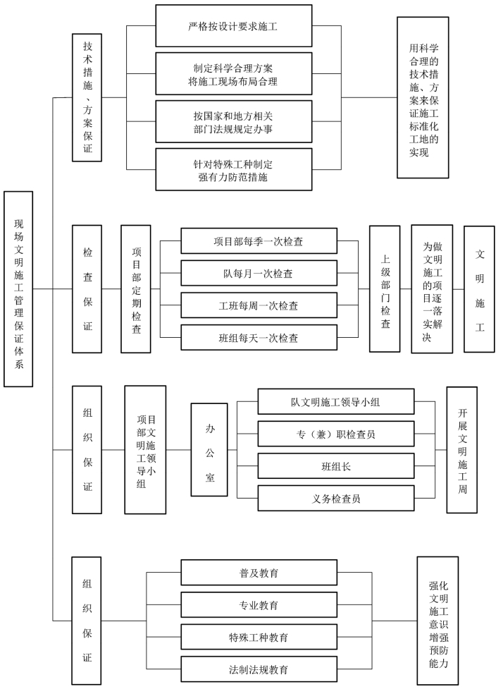 现场文明施工管理保证体系必须从思想上、组织上、技术措施、方案和检查保证制度上四个方面体现,详见图11。