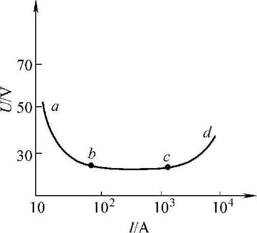 焊接电流与电弧电压之间的关系常用一条曲线表示,这条曲线称为焊接电弧静特性曲线,如图3-5所示。