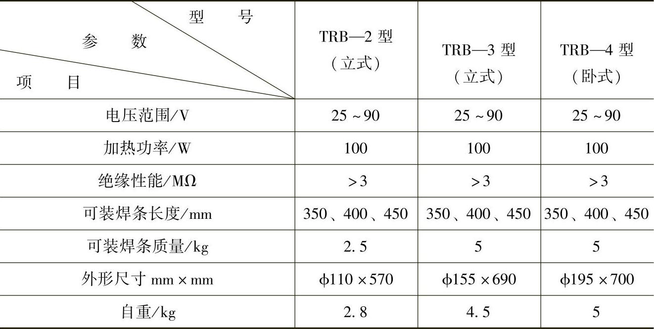 焊条保温筒是在施工现场,供焊工携带的可储存少量焊条的一种保温容器,如图4-4所示。焊条保温筒是焊工在工作时为保证焊接质量不可缺少的工具,焊接压力容器时尤为重要。焊条保温筒与电焊机的二次电压相连,使其保持一定的温度。能保持筒内的焊条干燥,防止经过烘干后的焊条在使用过程中再次受潮,从而保证焊条的工艺性能和焊接质量。使用焊条保温筒时,先将焊条装入筒内,盖好上盖,按需要将调温器调至规定温度,在弧焊电源送电的情况下,将鳄鱼卡卡在地线上,把焊把线卡在接线柱上,即可对焊条加热保温。取焊条前,应将焊把取下,切断焊条保温筒电源。从筒中取焊条时,应先将筒内托盘提起,以防烫伤。焊条保温筒不要放在潮湿处,放置要平稳,避免碰撞,以免损伤内部元件。焊条保温筒分为立式和卧式两种,温度可达200℃,可装焊条质量分别为2.5kg、5kg。焊条保温筒的主要技术数据见表4-3。