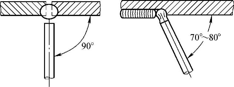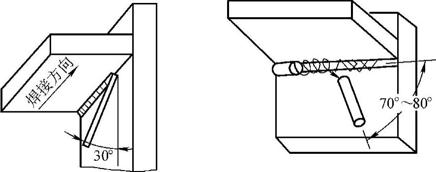 图4-56 T形接头仰角焊的焊条角度和运条方法