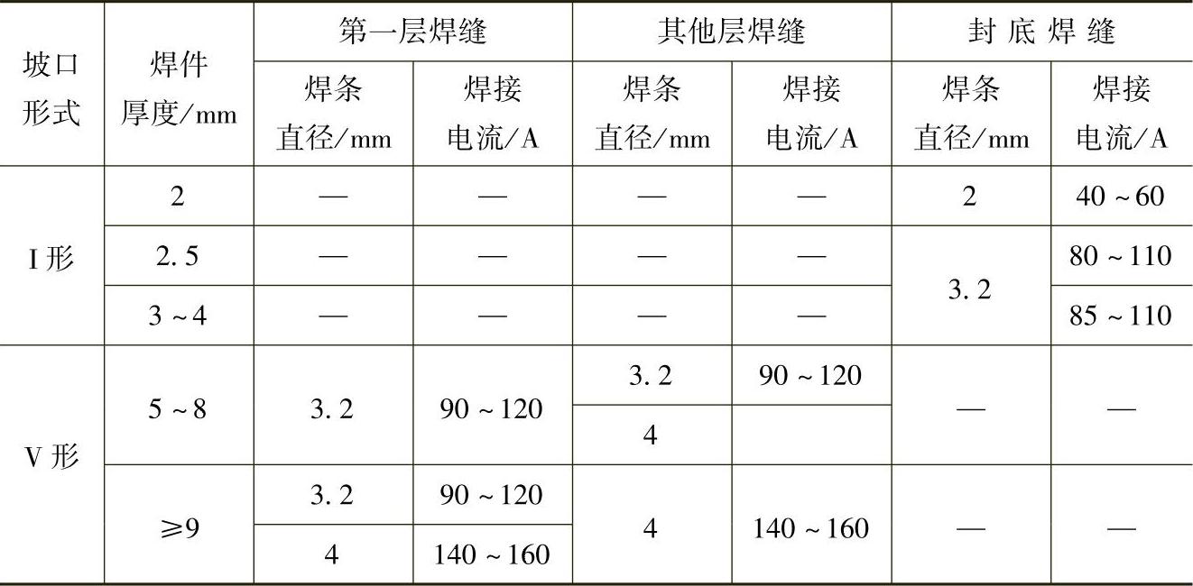 (2)V形坡口对接仰焊 当焊件厚度大于4mm时,可采用V形坡口对接仰焊,一般采用多层焊或多层多道焊。