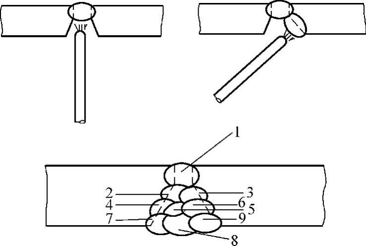 多层多道焊时,其操作比多层焊容易掌握,宜采用直线形运条法。各焊层的焊道排列顺序如图4-55所示。焊条角度应根据角焊缝的具体位置作相应的调整(见图4-55),以利于熔滴的过渡和获得较好的焊缝成形。