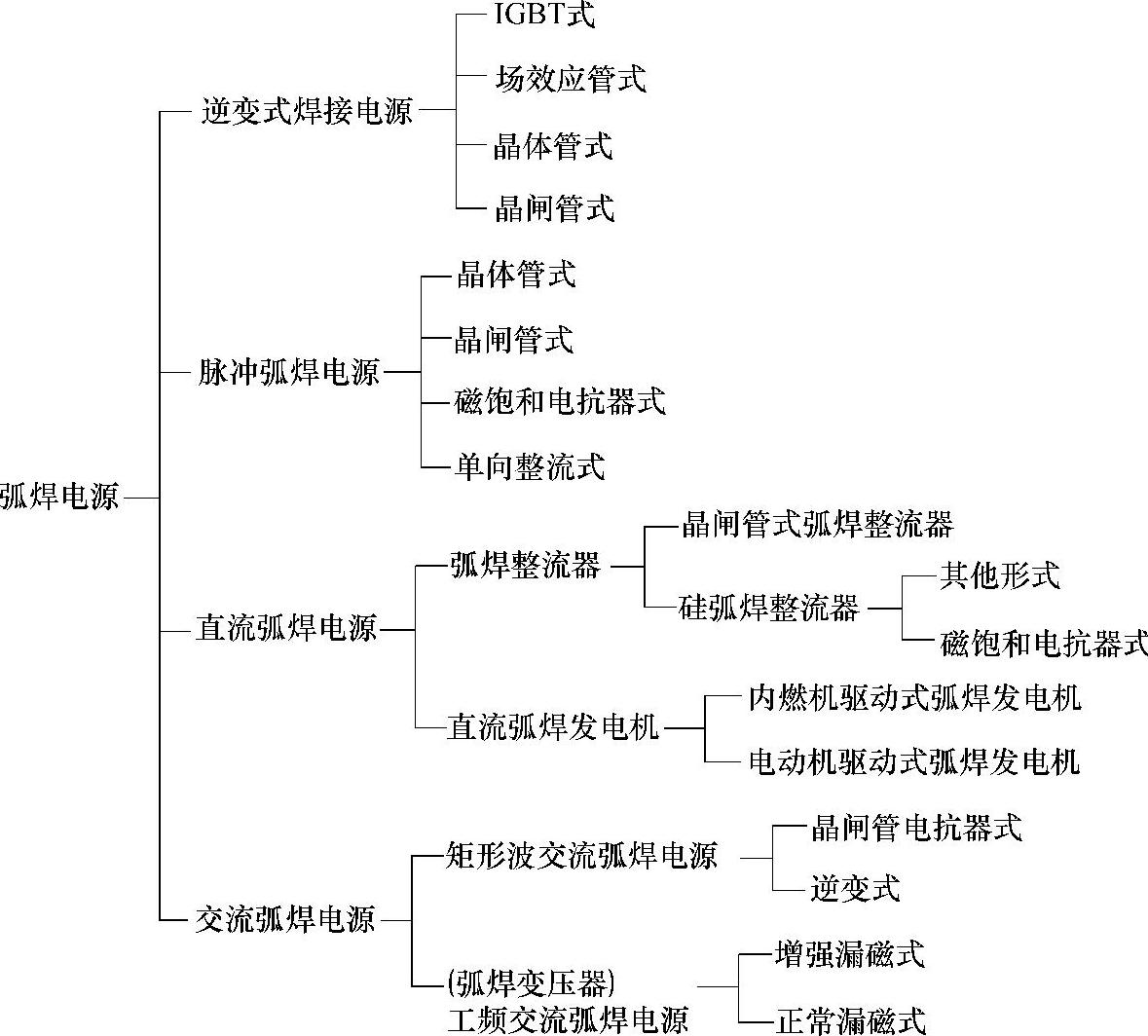 弧焊电源有多种分类方法。习惯上按其输出焊接电流波形的形状分为交流弧焊电源、直流弧焊电源、脉冲弧焊电源及逆变式弧焊电源。每大类弧焊电源再根据关键器件分小类,如图6-1所示。