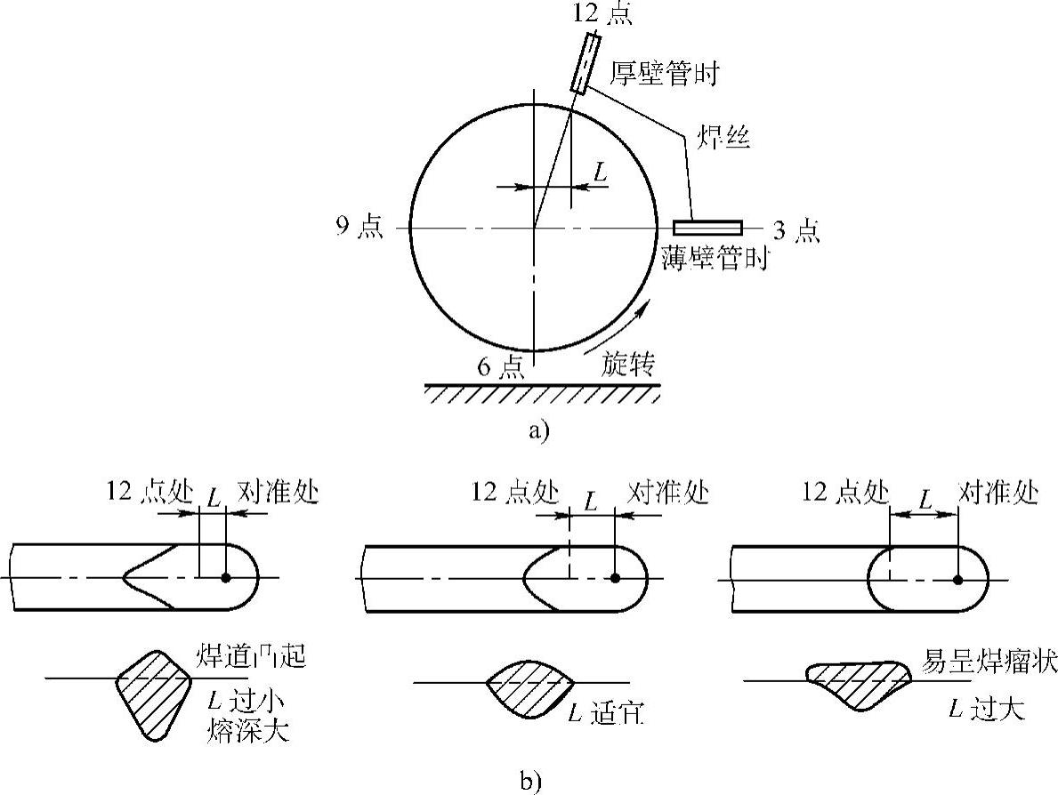 水平回转管焊接时是管子回转,焊枪固定不动。管子的回转速度即是焊接速度,这是一种自动焊方法。根据管子壁厚的不同,可选定合适的焊枪指向位置,如图8-28所示。如果是薄壁管,焊枪指向3点处,这时相当于向下立焊,壁薄而要求熔深浅,采用快速焊接可获得良好的焊缝成形。如果是厚壁管,则焊枪指向位置偏离12点处一定的距离L,这个L值的大小直接影响焊道成形。由图8-28b可见,当L过小时,熔深较大或余高凸起,成为梨形焊道;L过大时,熔深较小而表面下凹,趾端熔合不良,甚至形成焊瘤;只有当L适宜时,焊缝熔透,形状呈盆底状,余高适中,趾端平滑,成形理想。因此,对于厚壁管,可通过L值的合理调整,获得良好的焊缝形状。管子的直径越大,则L值越趋减小。