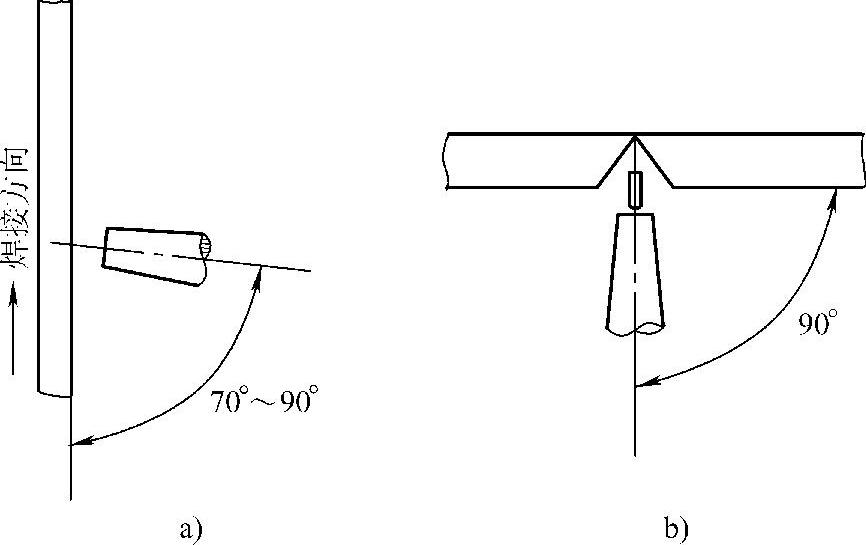 (1)打底焊 调试好焊接参数后,按图8-34所示的焊枪角度,从下向上进行焊接。在试件下端定位焊缝处引弧,电弧引燃后焊枪作锯齿形横向摆动向上施焊。当把定位焊缝覆盖、电弧到达定位焊缝与坡口根部连接处时,用电弧将坡口根部击穿,产生第一个熔孔,即转入正常施焊。