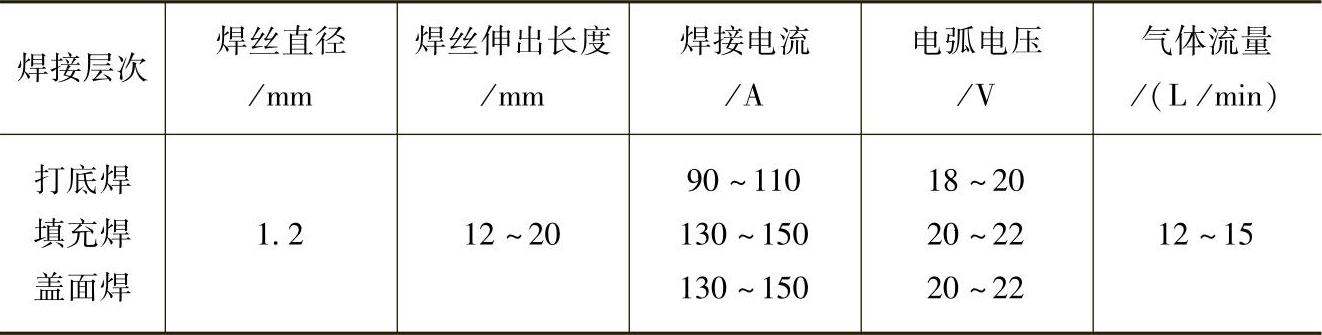 (2)填充焊 施焊前应先清除打底层焊道和坡口表面的飞溅、熔渣,并将焊道局部凸出处打磨平整。焊丝横向摆动幅度应比打底焊稍大,电弧在坡口两侧稍作停留,以保证焊道两侧熔合良好。填充焊道表面应比坡口边缘低1.5~2mm,并使坡口边缘保持原始状态,为施焊盖面层打好基础。