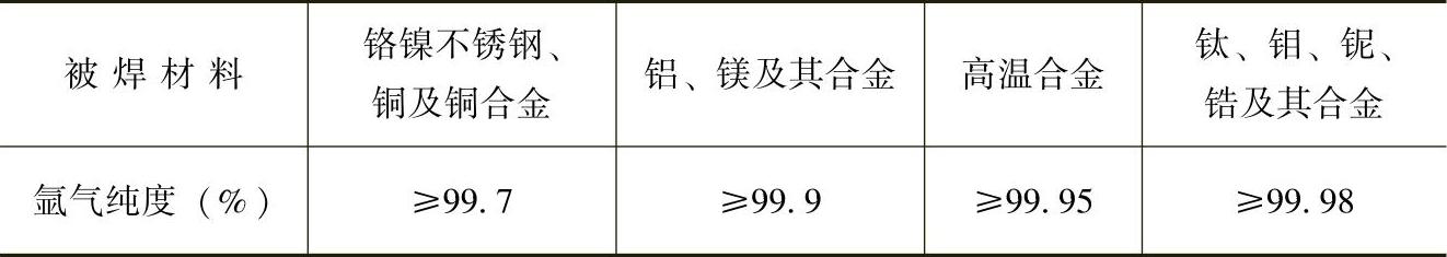 表9-1 不同材料的焊接对氩气纯度(体积分数)的要求